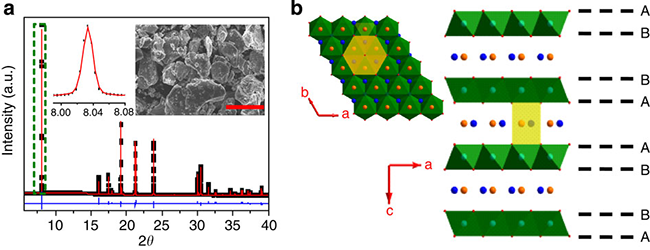 圖3 P2-Na0.66[Li0.22Ti0.78]O2材料的形貌及結構圖:(a) XRD圖譜及形貌,(b)樣品的結構圖