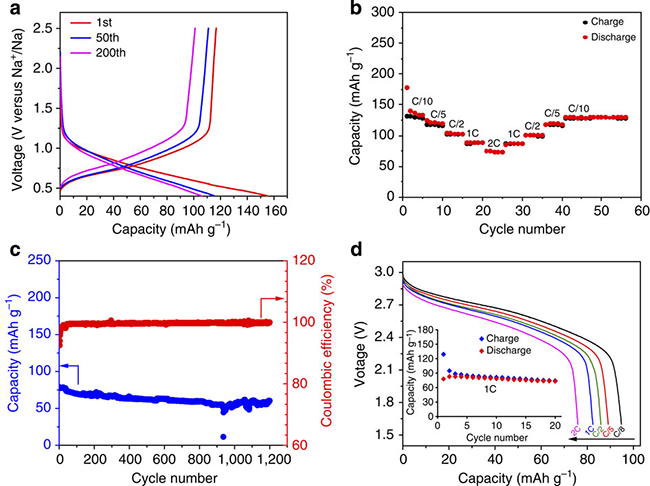 實驗結果分析表明,該材料為P2層狀氧化物,空間群為P63/mmc,Li\Ti占過渡金屬位,鈉占堿金屬層間的兩個位置(2b,2d),與上下氧形成三棱柱結構;材料的顆粒尺寸在10-15微米之間(如圖3所示);圖4a可以看出該材料在C/10倍率下顯示116 mAh/g左右的可逆容量,對應0.34個Na的嵌入和脫出,200周循環(huán)后容量保持率為88%;平均儲鈉電壓為0.75V,遠高于金屬鈉的沉積電位;充放電曲線為斜坡狀,可能為單相反應,與常見層狀P2相氧化物多相反應機制不同;同時該材料在2C的倍率下循環(huán)1200周后容量保持率為75%(圖4c),顯示極其穩(wěn)定的循環(huán)性能;當該負極材料與磷酸釩鈉/碳復合正極組裝成全電池時,其平均工作電壓為2.5V,顯示較好的循環(huán)和倍率性能(圖4d)。該材料室溫下Na+離子表觀擴散系數(shù)約為1×10-10cm2/s,與計算結果符合比較好,并和Li+離子嵌入石墨的擴散系數(shù)相當(圖8)。