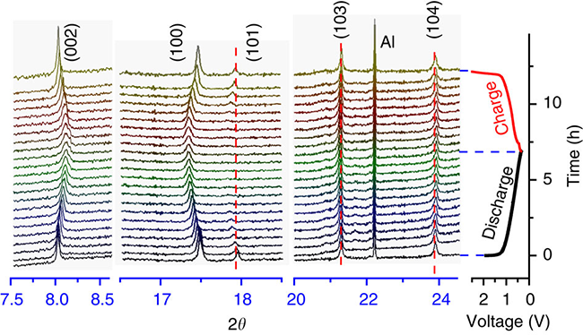 圖7. 化學鈉化過程中P2-Na0.66[Li0.22Ti0.78]O2材料的結構變化:同步輻射原位XRD圖譜