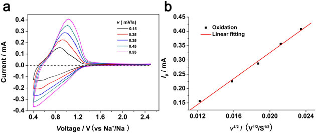 圖8 Na+離子表觀擴散系數(shù)測量:(a)不同掃描速度的CV曲線,(b)氧化峰電流與掃描速度(v1/2)的關系
