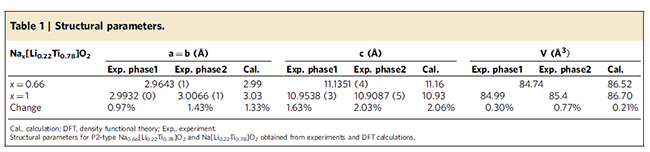 與美國Brookhaven國家實驗室楊曉青研究員和禹習謙博士等合作,采用同步輻射原位XRD技術對嵌/脫過程中材料結構的演化進行了深入研究。與傳統(tǒng)P2層狀材料在嵌/脫鈉反應過程中出現(xiàn)多個相變的反應機理不同,研究人員發(fā)現(xiàn)鋰摻雜過渡金屬層的P2層狀材料在嵌/脫鈉過程中表現(xiàn)出近似單相行為(圖5為充放電過程中的原位XRD圖譜)。對材料放電態(tài)(完全嵌鈉狀態(tài))的結構進行精確確定,進一步證明材料仍然保持P2層狀結構,嵌鈉前后體積變化僅為0.77%(見表1),近似零應變,這也說明了該材料為什么顯示了極其穩(wěn)定的循環(huán)性能。為了避免電化學非原位測試制備過程中樣品可能暴露空氣從而導致Ti3+氧化,同時也采用化學鈉化原位XRD技術,結果同樣表明鈉在嵌入過程中材料保持P2層狀結構,這為鈉的嵌入\脫出材料結構的變化提供了有力的證據(jù),具體結果如圖6和7所示。