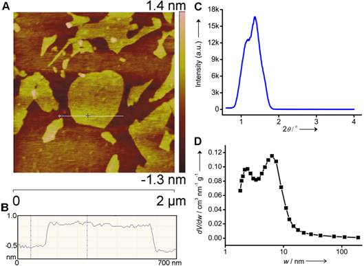 圖1(A和B)石墨烯的原子力照片;(C)小角X-射線衍射圖;(D)孔徑分布圖
