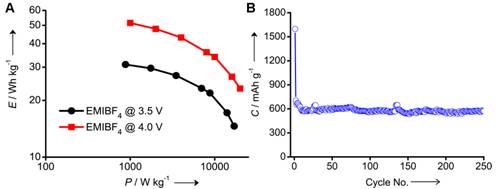 圖2(A)石墨烯基對(duì)稱型超級(jí)電容器在離子液體電解液下的能量密度和功率密度關(guān)系曲線;(B)石墨烯作為鋰離子電池負(fù)極材料的循環(huán)壽命