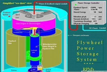 1994年,美國(guó)阿貢(ANL)國(guó)家實(shí)驗(yàn)室用碳纖維試制一個(gè)儲(chǔ)能飛輪:直徑38厘米,質(zhì)量為 11千克,采用超導(dǎo)磁懸浮,飛輪線速度達(dá)1000米/秒。它儲(chǔ)的能量可將10個(gè)100瓦燈泡點(diǎn)燃2~5小時(shí)。該實(shí)驗(yàn)室目前正在開(kāi)發(fā)儲(chǔ)能為50千瓦小時(shí)的儲(chǔ)能輪,最終目標(biāo)是使其儲(chǔ)能達(dá)5000千瓦小時(shí)的儲(chǔ)能飛輪。一個(gè)發(fā)電功率為100萬(wàn)千瓦的電廠,約需這樣的儲(chǔ)能輪200個(gè)。