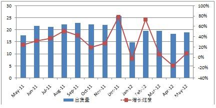 第二個原因,由于三元材料的電壓平臺低,使得鎳鈷錳鋰電池大部分在筆記本電腦中使用,少部分用在手機中。根據(jù)高工鋰電產(chǎn)業(yè)研究所(GBII)數(shù)據(jù)整理顯示,2012年1~5月份我國筆記本電腦出貨量為9171萬臺,同比增長7.90%,2011年同期出貨量增長速度為17.68%;特別是剔除春節(jié)因素后的3月份同比增長5.67%,4月份同比下滑16.27%,5月份同比增長7.85%(圖3)。筆記本電腦產(chǎn)量增長速度的大幅下降,自然而然會壓制三元材料產(chǎn)量的增長。