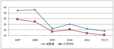 根據(jù)高工鋰電產(chǎn)業(yè)研究所(GBII)調研結果顯示,2012年上半年三元材料的毛利率為19%,比2011年微升1.5個百分點,毛利率上升的原因主要是鎳價同比下降20%,前驅體的價格降幅也在20%左右,三元材料成品價格的降幅15%左右(圖7)。我國三元材料行業(yè)的盈利能力取決于鎳價走勢,一旦鎳價往上走,很有可能面臨全行業(yè)虧損的局面。