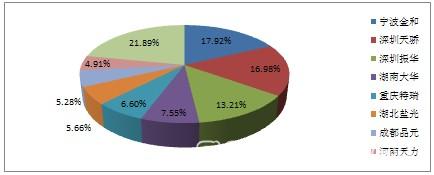 從產(chǎn)量排名看,前五名的廠家是寧波金和、深圳天驕、深圳振華、湖南大華和重慶特瑞,他們的產(chǎn)量分別是950噸、900噸、700噸、400噸和350噸;前五名廠家占全國三元材料產(chǎn)量比例為62.83%(圖5)。金和、天驕和振華“三巨頭”依然占據(jù)我國三元材料市場的大部分份額,但是市場競爭格局卻發(fā)生明顯變化:1、寧波金和在產(chǎn)量上首次超越深圳天驕,成為三元材料產(chǎn)量第一的廠家,寧波金和主要得益于ATL的訂單;2、深圳天驕實際控制人更迭,對公司的發(fā)展造成一定影響,導致公司增長速度落后于寧波金和。隨著控制權花落廈門市帛石貿(mào)易有限公司,深圳天驕或將進入正常發(fā)展軌道;3、河南思維由于各方面原因在2012年初的時候轟然倒下,從而在三元材料廠家名錄中消失,河南力天接手了他們的部分客戶。4、湖南大華由于開拓了精進能源等客戶,使得產(chǎn)量有了明顯的提升,是2012年三元材料市場最大的黑馬;5、河南福森、河南科隆、河南紅日、河南天力等一批河南三元材料企業(yè)正在崛起,隨著市場認可度的提高,他們的市場影響力不容忽視。