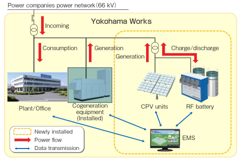 該系統(tǒng)包含有28個(gè)CPV裝置(最大總發(fā)電功率:200kW)*和一個(gè)氧化還原液流電池(容量:1MWx5小時(shí)),其中CPV裝置是產(chǎn)生可再生能源,而氧化還原液流電池則是CPV裝置所產(chǎn)生電力的存儲(chǔ)設(shè)備。通過(guò)與外部商業(yè)電網(wǎng)相連,該系統(tǒng)還能也晚間存儲(chǔ)電力公司提供的電力。該系統(tǒng)還配有一個(gè)能源管理系統(tǒng)(EMS),該系統(tǒng)能監(jiān)測(cè)CPV裝置的發(fā)電量、電池蓄電量和耗電量,并將監(jiān)測(cè)數(shù)據(jù)存儲(chǔ)至中央服務(wù)器內(nèi)。
