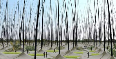 每個風(fēng)力莖桿頂端都有一個LED燈,當(dāng)風(fēng)流吹拂時就會發(fā)亮,當(dāng)處于強(qiáng)風(fēng)流狀態(tài)下將變得更加明亮。Atelier DNA公司預(yù)計風(fēng)力莖桿將表現(xiàn)得更加自然,在空中風(fēng)流吹拂下振動。