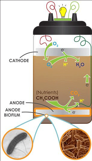 在這種特殊的電池內(nèi)部的無氧溶液環(huán)境中,這些細(xì)菌釋放出二氧化碳,質(zhì)子和電子。自由電子于是便構(gòu)成了負(fù)電極,而質(zhì)子則構(gòu)成正電極。這樣電流便產(chǎn)生了。