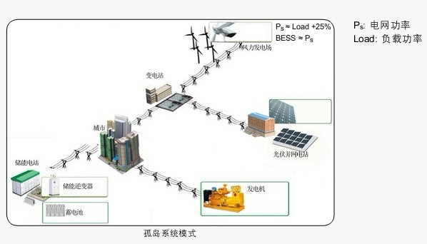 孤島系統(tǒng)模式是BESS與一個或多個發(fā)電系統(tǒng)并聯(lián)形成一個局部的“微網(wǎng)”。孤島系統(tǒng)的主要特征是局部電網(wǎng)與大電網(wǎng)脫離,BESS的額定功率與局部電網(wǎng)產(chǎn)生的總功率大致相等。在這個系統(tǒng)中,BESS必須可以充當網(wǎng)路電源,給“微網(wǎng)”提供電壓和頻率控制。