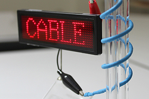 扭一扭:在被扭曲和拉緊的狀況下,線狀鋰離子電池依然能為L(zhǎng)ED顯示屏供電。(圖片來源:樂金化學(xué))