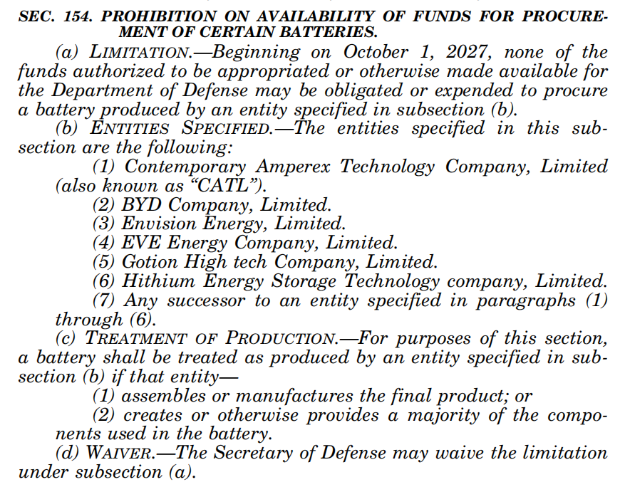 中國儲能網(wǎng)訊:據(jù)美國彭博新聞社20日報道,美國國會將禁止五角大樓從6家中國企業(yè)采購電池,這是美國國會試圖進一步推動國防部供應(yīng)鏈與中國“脫鉤”。