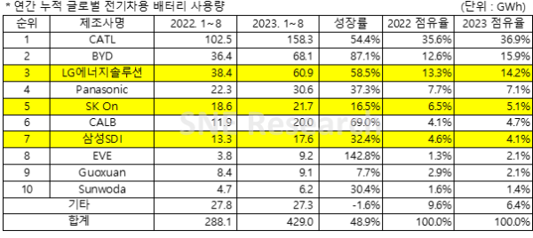 2023年1—8月,全球動力電池裝車量為429GWH,同比增長48.9%。中國六家電池企業(yè)入名前十,整體市占率63.1%,較去年同期的58.1%大幅增加5個百分點。而韓國三家公司合計市場份額為23.4%,比去年同期下降1個百分點。作為唯一入榜前十的日本企業(yè),日本松下的市場份額同比下降0.6個百分點。