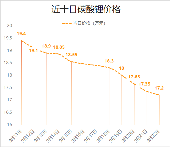 中國儲能網(wǎng)訊:據(jù)上海有色網(wǎng)最新報價顯示,9月22日,國產(chǎn)電池級碳酸鋰跌1500元報17.20萬元/噸,創(chuàng)2021年10月以來新低,已連跌14日。國產(chǎn)電池級粗顆粒氫氧化鋰跌2000.0元報16.3萬元/噸,創(chuàng)今年新低,連跌50天,近5日累計跌9000.0元。