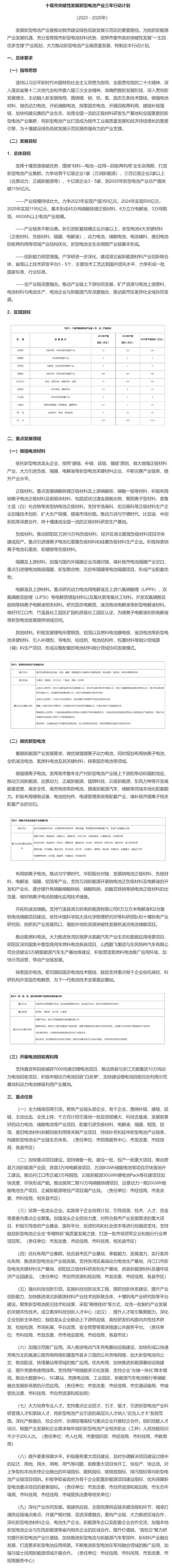其中,總體目標(biāo)提出發(fā)揮十堰資源稟賦優(yōu)勢(shì),圍繞“材料—電池—應(yīng)用—回收再利用”全生命周期,打造新型電池產(chǎn)業(yè)集群。力爭(zhēng)2023年實(shí)現(xiàn)產(chǎn)值350億元,2024年實(shí)現(xiàn)500億元,2025年實(shí)現(xiàn)1150億元,基本形成45萬(wàn)噸磷酸鐵鋰正極材料、6萬(wàn)立方電解液、3萬(wàn)噸銅箔、40GWh以上電池產(chǎn)業(yè)規(guī)模。
