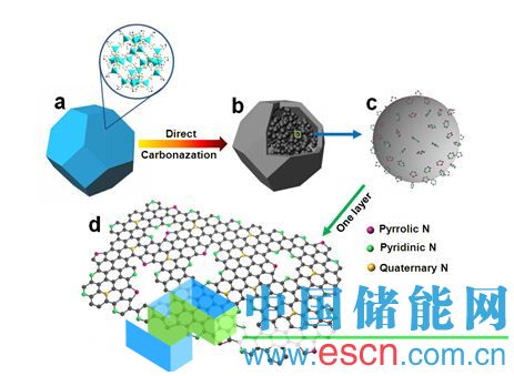 氮摻雜類石墨烯粒子制備過程和氮摻雜模型示意圖。(a) ZIF-8;(b) 富氮碳多面體(含大量類石墨烯粒子);(c) 一個放大的類石墨烯粒子,邊緣氮摻雜;(d) 一層石墨烯的邊緣和晶格里三種氮結(jié)合構(gòu)型。