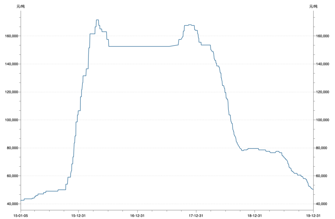這波漲幅在2019年底停止了,新能源汽車補(bǔ)貼開(kāi)始取消——國(guó)家補(bǔ)貼減半,地方補(bǔ)貼完全取消,動(dòng)力電池需求同時(shí)減弱,價(jià)格開(kāi)始快速下墜,一年的時(shí)間基本回到最初的位置。