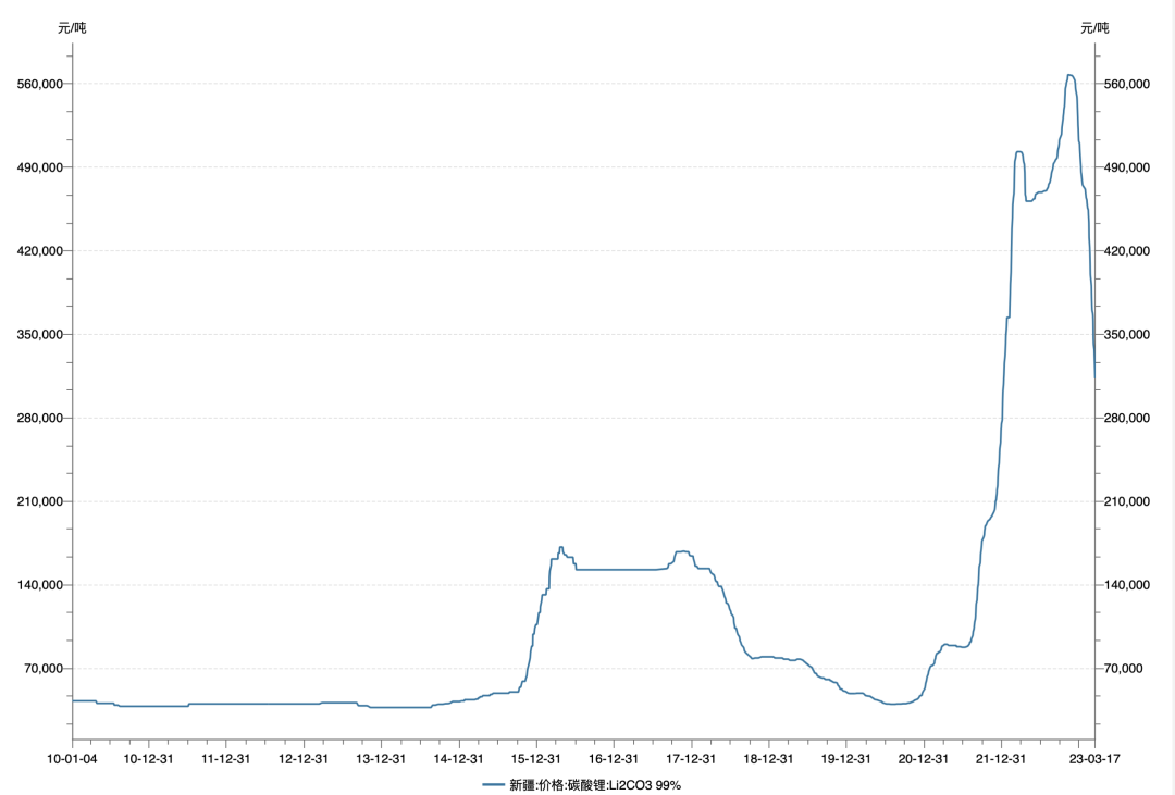 但是這些政策不如需求下降來(lái)得管用,2023年2月,隨著動(dòng)力電池的需求下降,碳酸鋰的價(jià)格自然一路下跌,囤積的碳酸鋰開(kāi)始大量拋貨。