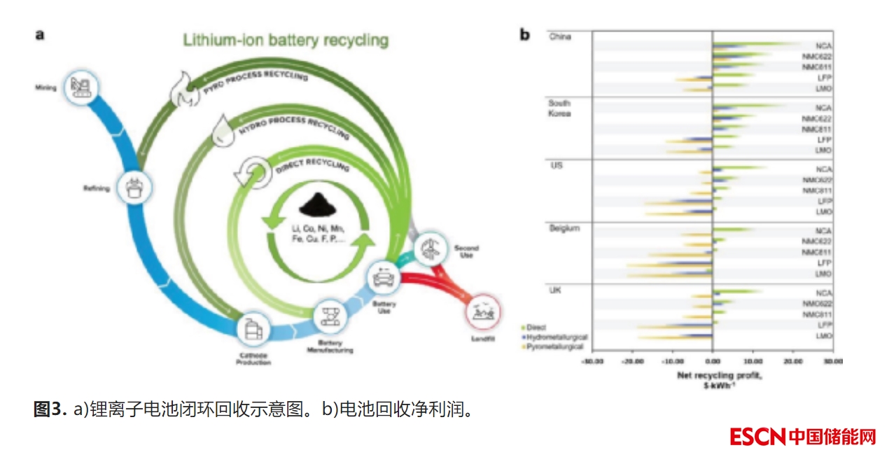 文章最后探討了鋰電池的回收利用問題。未來幾十年間不斷擴大的鋰電池儲能規(guī)模將會加劇及凸顯資源短缺(例如鋰、鈷、鎳等資源)和環(huán)境污染(電子垃圾、生產(chǎn)制造等)的問題。我們急需提升鋰電池回收的比例(目前回收率仍<10%)以及在回收方法上實現(xiàn)突破。截至2019年,全球只有5%的鋰離子電池得到回收,它們都旨在以金屬形式提取有價值的金屬,如Co和Ni。此外,傳統(tǒng)的火法/濕法冶金效率低、對環(huán)境不友好、以及不適用于回收磷酸鐵鋰等不含有稀缺金屬的材料。