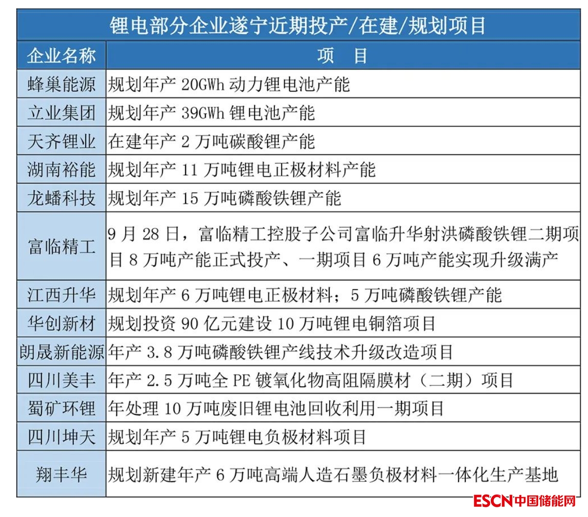 據(jù)不完全統(tǒng)計,鋰電部分企業(yè)在遂寧近期投產(chǎn)/在建/規(guī)劃項目如下所示: