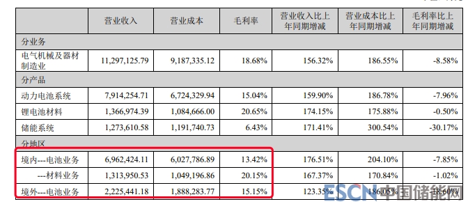 從寧德時(shí)代發(fā)布的財(cái)報(bào)來看,2022年上半年其境外電池業(yè)務(wù)的收入規(guī)模雖不及境內(nèi),但毛利率水平卻優(yōu)于境內(nèi)。財(cái)報(bào)顯示,寧德時(shí)代2022年上半年境外電池業(yè)務(wù)營(yíng)業(yè)收入約為222.54億元,同比增長(zhǎng)123.35%,毛利率為15.15%;境內(nèi)電池業(yè)務(wù)營(yíng)業(yè)收入約為696.24億元,同比增長(zhǎng)176.51%,毛利率為13.42%。