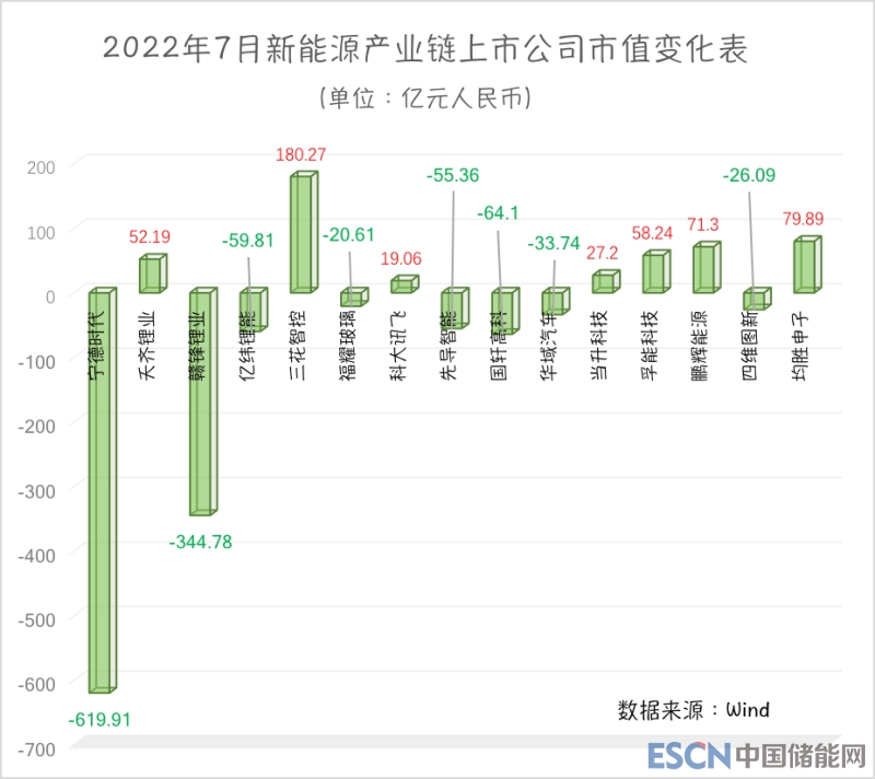 7月,新能源汽車產(chǎn)業(yè)鏈呈現(xiàn)出“冰火兩重天”的局面。動力電池巨頭寧德時代市值約減少了619.91億元;贛鋒鋰業(yè)(SZ002460,股價93.81元,市值1892億元)市值減少344.78億元;國軒高科(SZ002074,股價42.46元,市值755.3億元)市值減少約64.1億元。