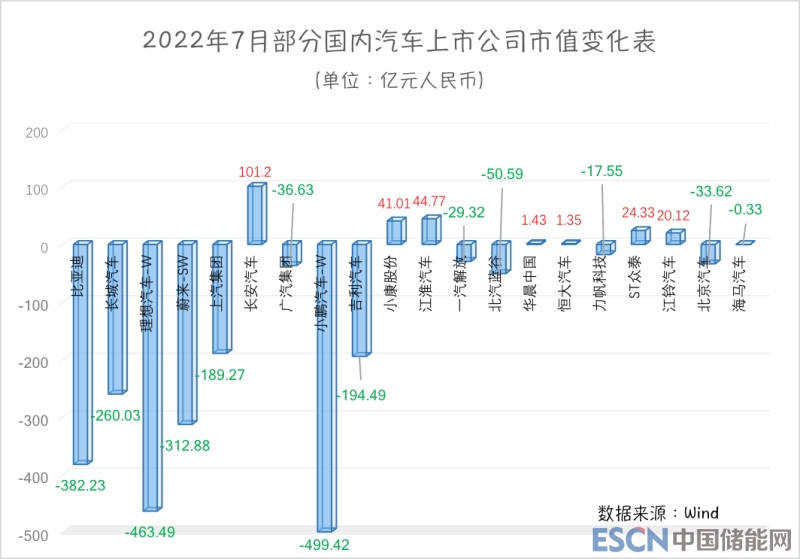資本市場上,海外新能源概念股一改今年上半年的頹勢,7月開始全面反彈。特斯拉(TSLA,股價869.74美元,市值億9084美元)、福特汽車(F,股價15.08美元,市值606.3億美元)、Rivian(RIVN,股價33.06美元,302.9億美元)的市值在7月分別環(huán)比增加33.46%、31.97%和33.30%。而國內(nèi)市場則出現(xiàn)回調(diào),部分車企短暫承壓,其中,比亞迪(SZ002594,股價323.09元,市值9406億元)、寧德時代(SZ300750,股價551.53元,市值1.35萬億元)市值在7月分別環(huán)比下滑3.94%和4.76%。