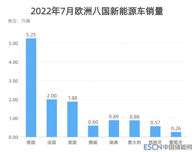 公開資料顯示,7月,德國、法國、挪威、英國、瑞典、意大利、西班牙、葡萄牙等八國純電動車銷量分別為5.25萬輛、2.00萬輛、0.60萬輛、1.88萬輛、0.89萬輛、0.88萬輛、0.57萬輛和0.26萬輛,合計銷量約為12.34萬輛,同比下滑5.5%,環(huán)比下滑29.1%。