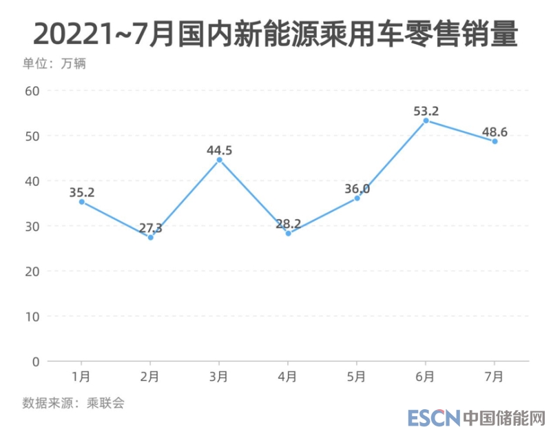 據(jù)乘聯(lián)會數(shù)據(jù),7月國內(nèi)新能源乘用車零售銷量為48.6萬輛,同比增長117.3%,環(huán)比下降8.5%;1~7月,國內(nèi)新能源乘用車累計零售273.3萬輛,同比增長121.5%。