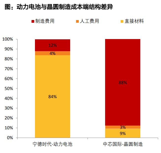 對(duì)比同一產(chǎn)業(yè)位置的晶圓制造可以發(fā)現(xiàn),寧德時(shí)代的成本結(jié)構(gòu)中超過(guò)80%都是直接材料費(fèi),人工和制造費(fèi)用降低空間極小,而中芯國(guó)際的直接材料費(fèi)僅為9%。