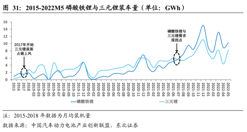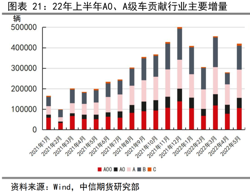 如上圖所示,2022年1-5月,A級(jí)車銷58.0萬(wàn)輛,同比增長(zhǎng)157%;B級(jí)車銷55.0萬(wàn)輛,同比增長(zhǎng)112%,增速均超過(guò)了A00級(jí)車。所以,磷酸錳鐵鋰的裝機(jī)量或?qū)O大受益于這一趨勢(shì)變化。