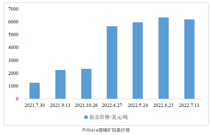 新能源汽車產(chǎn)業(yè)的快速發(fā)展導(dǎo)致鋰電池需求量激增,鋰電礦產(chǎn)資源成為多方爭(zhēng)搶的稀缺資源,鋰價(jià)在過去一年已經(jīng)上漲了490%。根據(jù)公開數(shù)據(jù)顯示,澳大利亞主力礦商Pilbara(全球鋰精礦價(jià)格走勢(shì)風(fēng)向標(biāo))自2021年7月30日至2022年的7月13日,共拍賣了7次,鋰輝石精礦從1250美元/噸增長(zhǎng)至6188美元/噸。