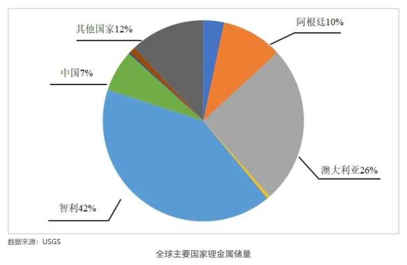根據(jù)美國(guó)地質(zhì)調(diào)查局USGS最新公布的數(shù)據(jù)顯示,2021年全球鋰金屬總儲(chǔ)量為2200萬噸,其中,智利的鋰金屬儲(chǔ)量最多,為920萬噸,占全球總量的41.8%;澳大利亞的鋰金屬儲(chǔ)量為570萬噸,占全球總量的25.9%;阿根廷的鋰金屬儲(chǔ)量為220萬噸,占全球總量的10%;中國(guó)的鋰金屬儲(chǔ)量為150萬噸,占全球總量的6.8%。這四個(gè)國(guó)家的鋰金屬儲(chǔ)量達(dá)到全球總儲(chǔ)量的90%以上,儲(chǔ)量相對(duì)集中。
