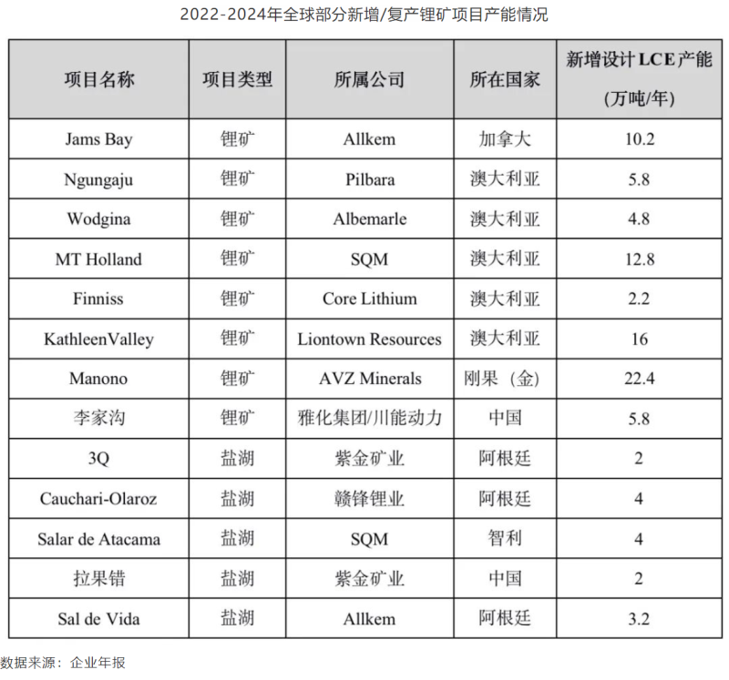 2022-2024年全球部分新增/復(fù)產(chǎn)鋰礦項(xiàng)目產(chǎn)能情況