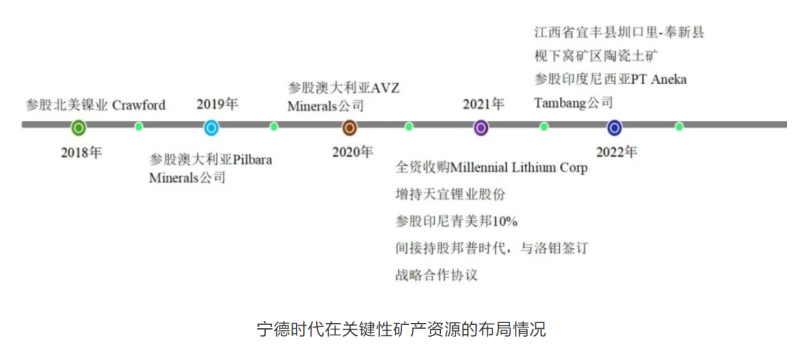電池生產(chǎn)龍頭企業(yè)寧德時(shí)代,自2018年開始布局國(guó)內(nèi)外的關(guān)鍵性資源。具體的布局情況如圖所示。
