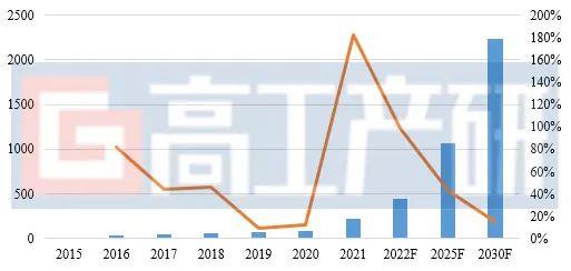 2015-2030年中國動力鋰電池出貨量及預(yù)測(單位:GWh,%)