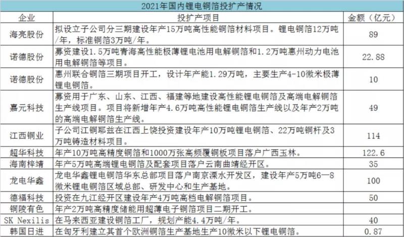 進(jìn)入2021年,鋰電銅箔企業(yè)擴(kuò)產(chǎn)提速,且新建產(chǎn)能規(guī)模和投資額較此前規(guī)劃項目都大幅提升,并加快新建產(chǎn)能釋放,預(yù)計2022年國內(nèi)鋰電銅箔供應(yīng)緊張的情況將得到逐步緩解。