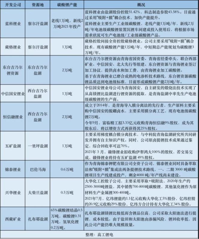 從國(guó)內(nèi)鹽湖提鋰市場(chǎng)情況看,由于高原地區(qū)的生產(chǎn)環(huán)境惡劣、提取技術(shù)水平要求高、前期投入成本高,國(guó)內(nèi)布局鹽湖提鋰規(guī)?;髽I(yè)主要集中在藍(lán)科鋰業(yè)、藏格控股、東臺(tái)吉乃爾鋰資源/青海鋰業(yè)、恒信融鋰業(yè)、五礦鹽湖、錦泰鋰業(yè)、興華鋰業(yè)、西藏礦業(yè)等少數(shù)企業(yè)布局。