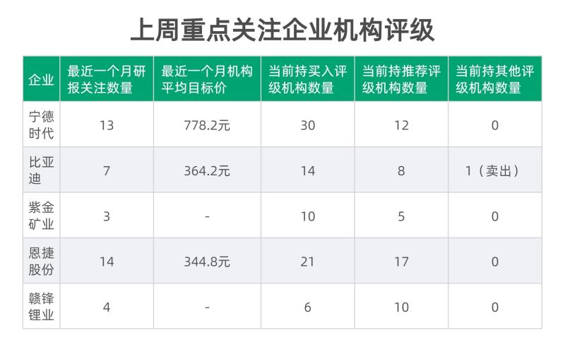 在上周重點(diǎn)關(guān)注的A、H股中新能源汽車上下游產(chǎn)業(yè)鏈?zhǔn)兄蹬琶壳暗?家上市公司中,寧德時(shí)代10月以來(lái)獲得13份券商研報(bào)關(guān)注,平均目標(biāo)價(jià)為778.20元/股。而比亞迪(002594.SZ)則獲得7份券商研報(bào)關(guān)注,其中3家給出了目標(biāo)價(jià),平均為364.2元/股。