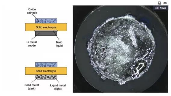 為了提供相似的液體-固體界面,該研究團(tuán)隊(duì)開發(fā)了一個(gè)半固體電極,放置于鋰金屬陽極與固體電解質(zhì)材料之間。這個(gè)半固體電極提供了一個(gè)可以自愈的表層,同時(shí)也有助于防止脆性電解質(zhì)表面出現(xiàn)微小裂紋,從而為樹突生長提供場所。半固體電極的材料是由鈉和鉀組成的,與牙醫(yī)用來填補(bǔ)蛀洞的固體金屬混合物相似,但仍然能夠流動(dòng)和成形。