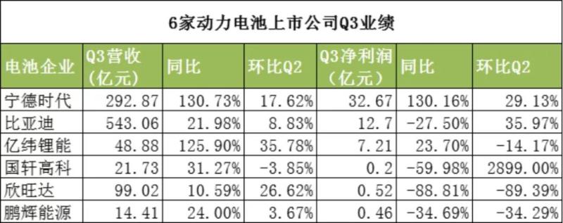 6家動力電池上市公司披露Q3業(yè)績,僅寧德時代、億緯鋰能兩家營收、凈利雙增,其余4家利潤同比均出現(xiàn)了不同程度的下降,其中1家環(huán)比Q2下降近9成。
