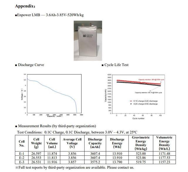 電池重量能量密度500 Wh/kg及體積能量密度1000 Wh/L的指標(biāo)是電池性能一個(gè)里程碑式的指標(biāo),被各大車企、電池巨頭以及各國(guó)的政府設(shè)定為2025至2030年的中長(zhǎng)期目標(biāo)(是“中國(guó)制造2025”規(guī)劃中2030年的目標(biāo))。恩力動(dòng)力在發(fā)布450 Wh/kg電池后,僅用了約半年時(shí)間便成功跨越了這一里程碑。本款超高比能鋰金屬電池,得到了包括軟銀(「Softbank Next-Generation Battery Lab」)在內(nèi)的中、日多家第三方機(jī)構(gòu)對(duì)多個(gè)電池樣本進(jìn)行了多次可重復(fù)的測(cè)試驗(yàn)證。本款軟包電池容量為3600 mAh,與市面上智能手機(jī)普遍使用的鋰離子電池容量大致相當(dāng),重量和體積能量密度分別提升了一倍,如果在同等重量及同等體積的情況下,單次充電后手機(jī)的使用時(shí)間可大幅延長(zhǎng),同樣,如能應(yīng)用在無(wú)人機(jī)和電動(dòng)汽車上,續(xù)航里程亦能得到大幅度提升。今后,恩力動(dòng)力將試制出單體電芯容量10Ah(10000mAh)以上的軟包電池,在電池內(nèi)部材料方面的設(shè)計(jì)不變的情況下,電池的能量密度還將被進(jìn)一步提升到540Wh/kg以上。目前,恩力動(dòng)力正與產(chǎn)業(yè)戰(zhàn)略伙伴密切協(xié)商、協(xié)作,致力于早日實(shí)現(xiàn)此款超高比能鋰金屬電池的產(chǎn)業(yè)化及商業(yè)化。