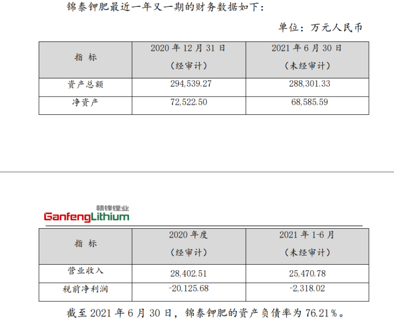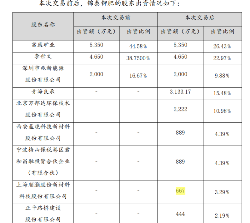 具體來(lái)看:贛鋒鋰業(yè)全資子公司青海良承礦業(yè)有限公司擬以自有資金向錦泰鉀肥增資7.05億元,其中3133.17萬(wàn)元為錦泰鉀肥新增的注冊(cè)資本,其余部分計(jì)入錦泰鉀肥的資本公積。本次交易完成后,青海良承將持有錦泰鉀肥15.48%的股權(quán);順灝股份擬使用自有資金1.5億元向錦泰鉀肥增資,其中667萬(wàn)元計(jì)入注冊(cè)資本;藍(lán)曉科技則以對(duì)錦泰鉀肥2億元債權(quán)認(rèn)購(gòu)錦泰鉀肥增資后4.3908%的股權(quán),對(duì)應(yīng)889萬(wàn)元新增注冊(cè)資本;萬(wàn)邦達(dá)以現(xiàn)金形式出資5億元對(duì)其進(jìn)行增資擴(kuò)股。增資完成后,公司將持有錦泰鉀肥約10.98%的股份;正平股份增資后,對(duì)錦泰鉀肥的持股比例為2.19%。