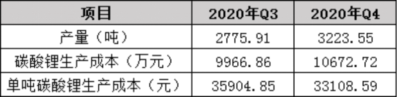 根據(jù)永興材料2020年年報(bào)顯示,2020年Q3碳酸鋰產(chǎn)線達(dá)產(chǎn)以來,至Q4碳酸鋰成本已降至3.3萬元/噸,季度產(chǎn)量提升至3223.55噸。