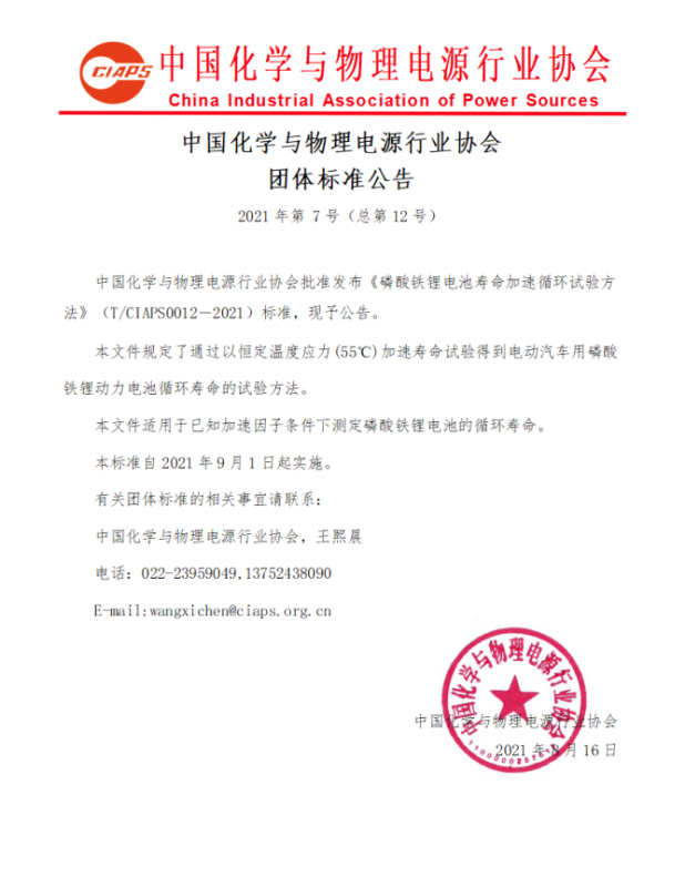 中國化學(xué)與物理電源行業(yè)協(xié)會批準(zhǔn)發(fā)布《磷酸鐵鋰電池壽命加速循環(huán)試驗(yàn)方法》(T/CIAPS0012―2021)標(biāo)準(zhǔn),現(xiàn)予公告。