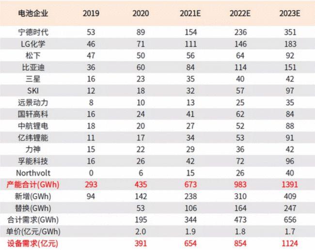 圖|鋰電產(chǎn)能及設(shè)備需求測(cè)算(來(lái)源:公司公告、中金公司研究部)