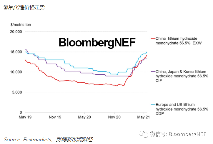 過去幾個月中,中國國內(nèi)的碳酸鋰對氫氧化鋰一直存在溢價,但幅度在今年5月份收窄,主要原因在于NMC正極材料生產(chǎn)商對氫氧化鋰的需求不斷上升,以及中國之外的氫氧化鋰價格不斷上漲。