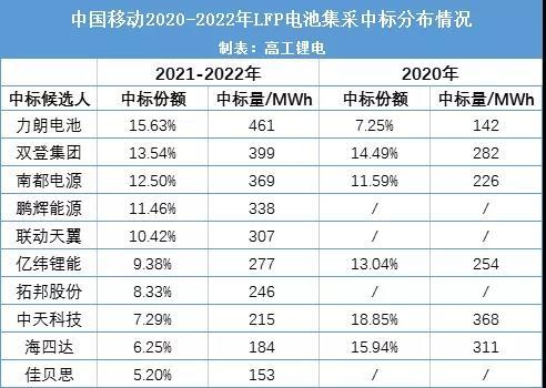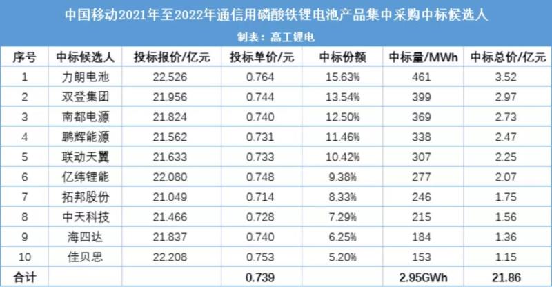 7月13日,中國移動(dòng)公示2021年至2022年通信用磷酸鐵鋰電池產(chǎn)品集中采購中標(biāo)候選人,力朗電池、雙登集團(tuán)、南都電源、鵬輝能源、聯(lián)動(dòng)天翼、億緯鋰能、拓邦股份、中天科技、海四達(dá)、佳貝思這10家企業(yè)中標(biāo)。
