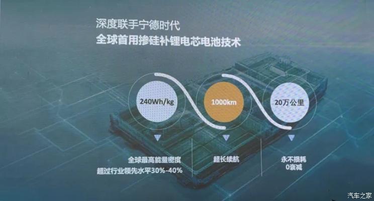 這個(gè)詞是智己汽車先拿出來(lái)的,號(hào)稱“電池由智己汽車與寧德時(shí)代采用“摻硅補(bǔ)鋰”技術(shù)合作研發(fā)而成,其電芯最高能量密度可達(dá)300Wh/kg,具有20萬(wàn)公里零衰減和永不自燃的特性”。